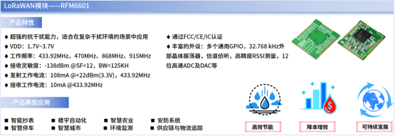 在远距离传输能力方面,由于农业生产地域广阔、地形复杂、布局分散,传统无线通信方式往往力不从心;而RFM6601搭载完整LoRaWAN协议栈,可自定义扩频因子与带宽,实现数公里乃至更大范围的远距离通信能力,并轻松跨越丘陵、林地、水面等多样地形;无论是果园土壤墒情、温室气候参数,还是麦田灌溉状态,RFM6601都能将这些生产数据准确无误地采集传输至云端的监测与控制系统中。