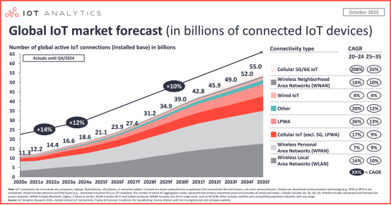 据全球物联网市场调研机构IoT Analytics数据显示,2025年全球物联网设备连接数预计将达到211亿台,同比增长约14%;