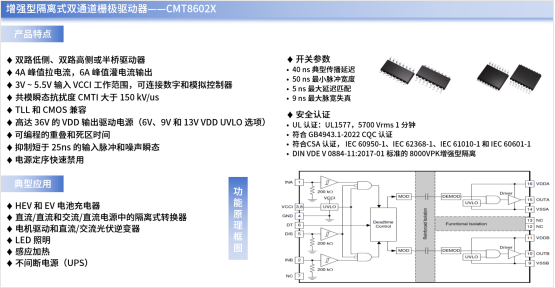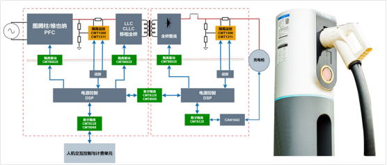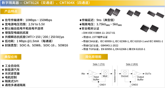 CMT812X、CMT804X支持高达5kV的隔离电压、低至9ns的传输延迟与150Mbps的最大速率,可有效提升汽车充电桩系统的控制精度与系统响应能力,确保数字信号的稳定传输,并解决强电侧与弱电侧的电位差、高频干扰及外部通信可靠性等问题,是汽车充电桩实现“安全、稳定、精准”充电的关键器件。