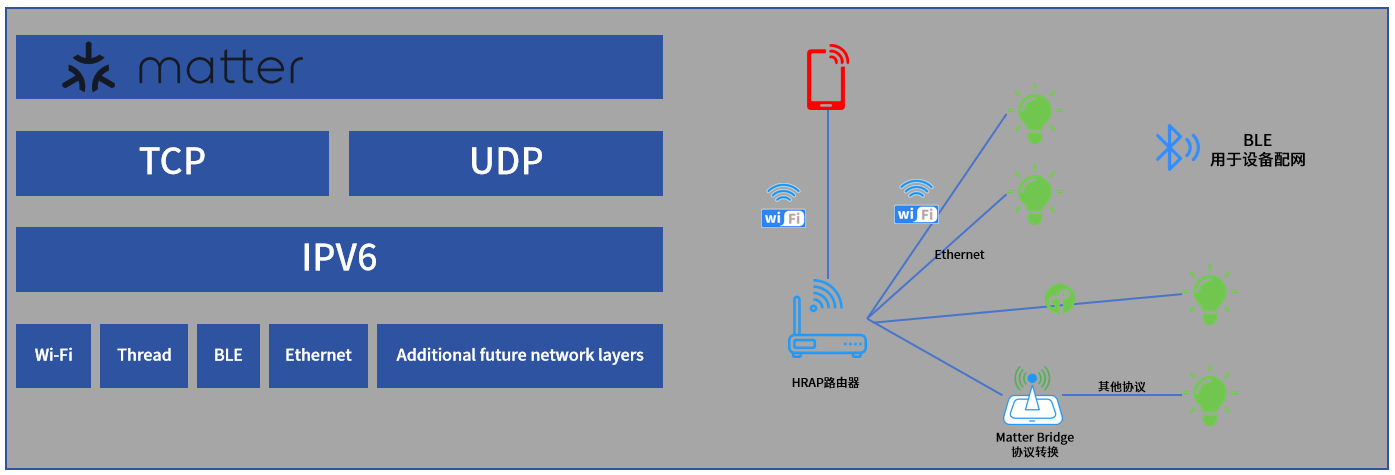 Matter标准是一个应用层协议,其本身并不定义新的通信协议,而是复用成熟的TCP/IP协议族(TCP/UDP为传输层协议,IPv6为网络层基础),因此采用Matter标准的智能家居设备只需遵循统一的应用层规范,即可兼容Wi-Fi、Thread、BLE与以太网等基于IP技术的底层通信协议。